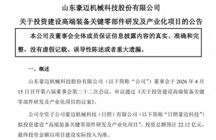| 4月16日,豪迈科技(证券代码:002595)发布公告称,公司全资子公司豪迈机械科技(日照)有限公司(以下简称“日照豪迈科技”)拟投资建设“高端装备关键零部件研发及产业化项目”,投资总额预计22.12亿元,最终投资金额以项目建设实际投入为准。